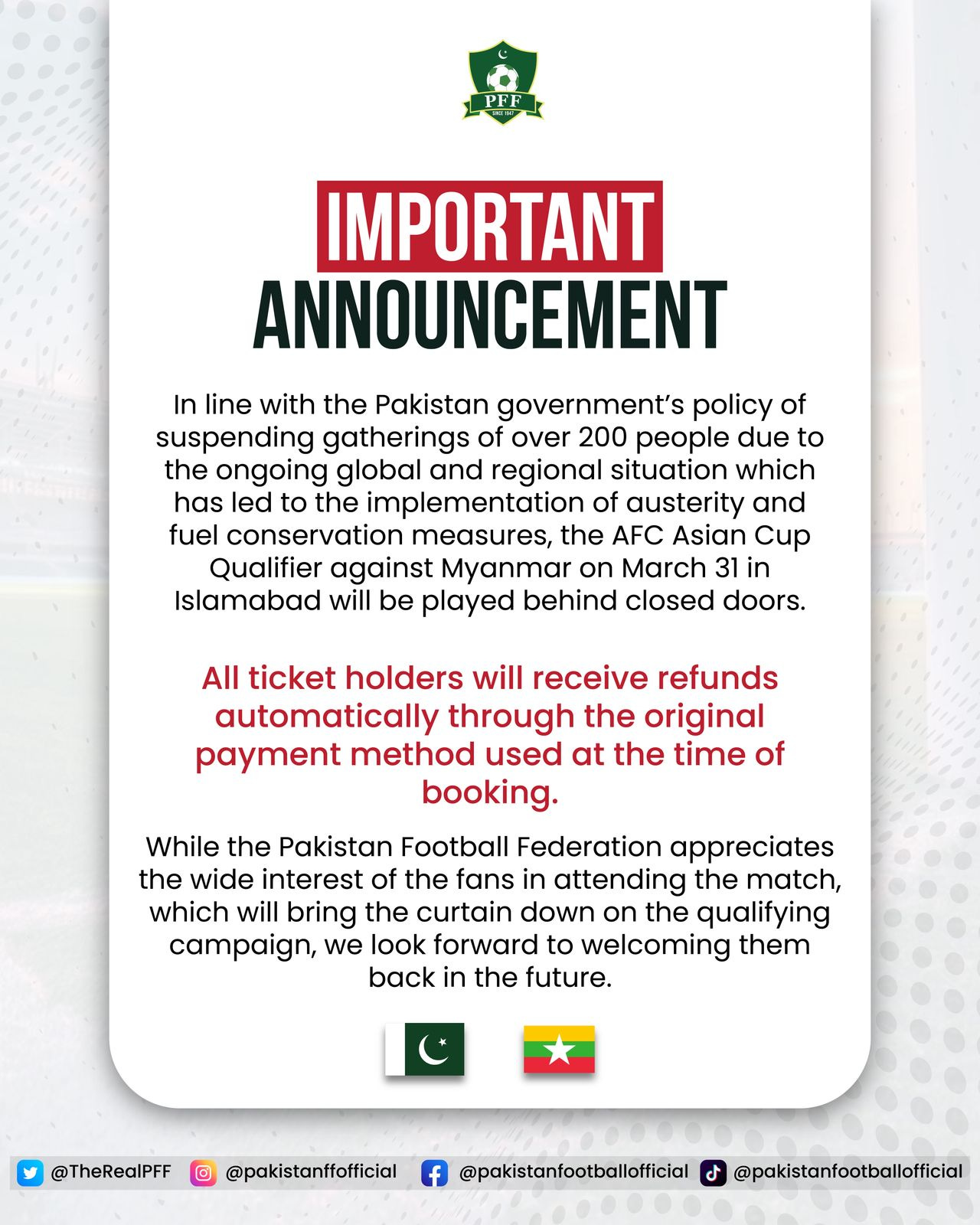 “In line with the Pakistan government’s policy of suspending gatherings of over 200 people due to the ongoing global and regional situation, which has led to the implementation of austerity and fuel conservation measures, the AFC Asian Cup Qualifier against Myanmar on March 31 in Islamabad will be played behind closed doors.